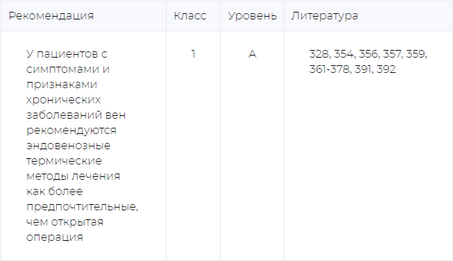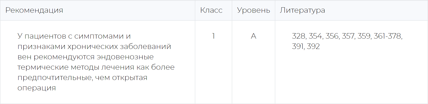 Таблица 1. Выдержка из Европейских рекомендаций по лечению варикозных вен. Класс 1, уровень А. Это значит, что у процедуры ЭВЛК самая высокая степень доказательности и профиль безопасности